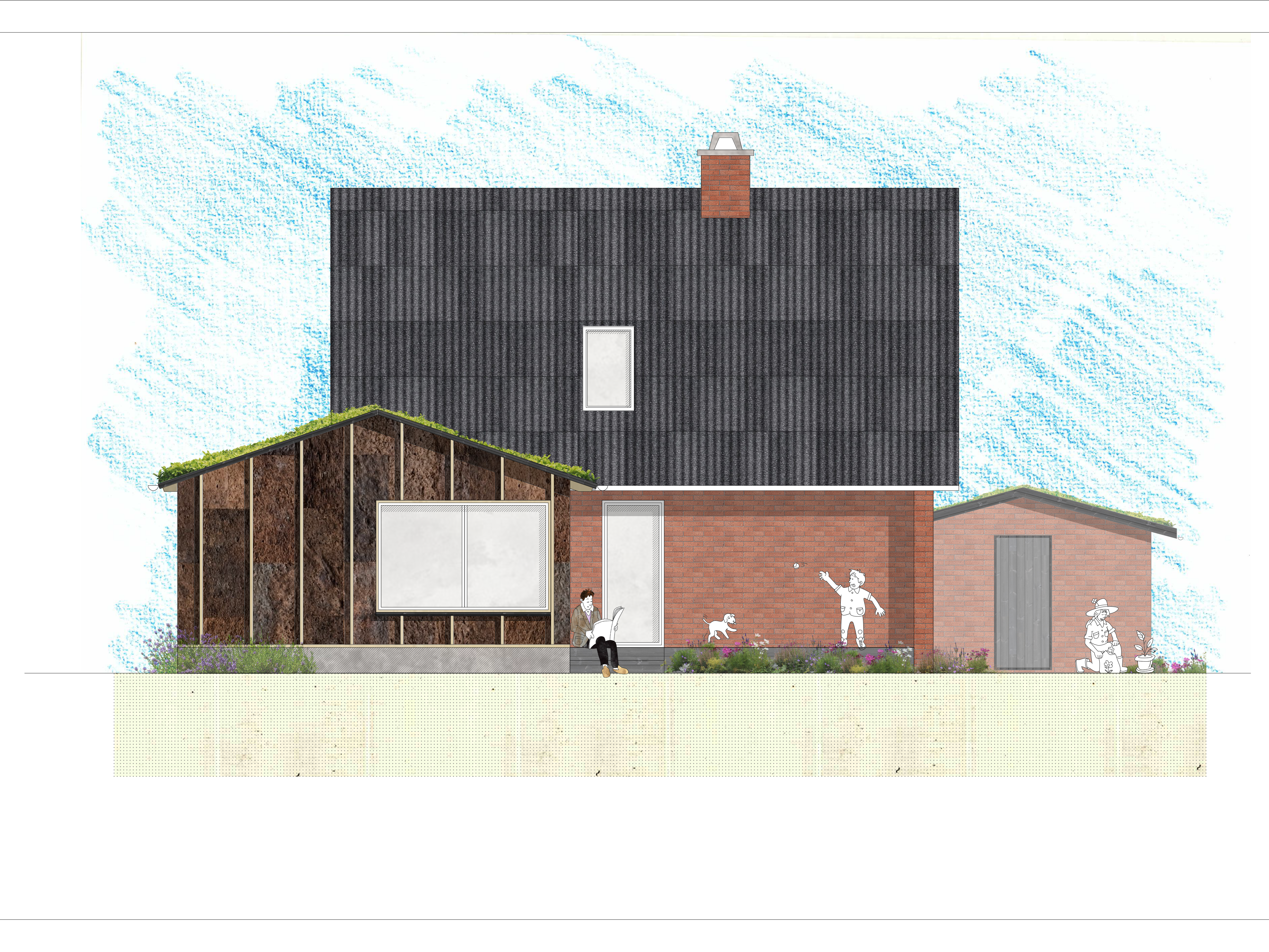 Ved at fjerne den eksisterende garage, og ligge et betondæk henover parkeringspladsen som er gravet ind i terrænet, opnår bygherren her en forøgelse af deres have, og et uforstyrret kig fra deres dagligstue.